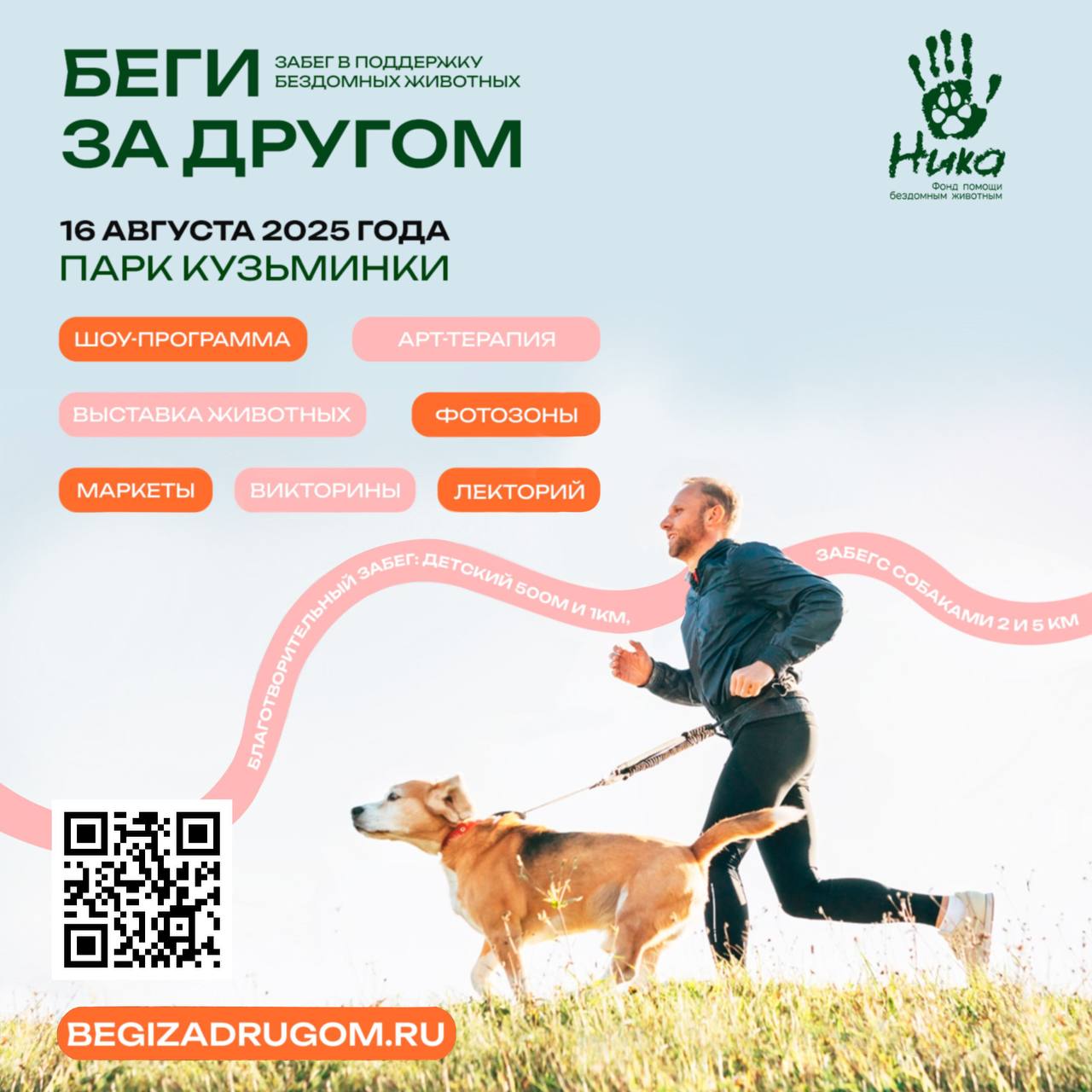 16 августа парк «Кузьминки» превратится в настоящий праздник доброты и заботы — здесь пройдёт благотворительный забег «Беги за другом», организованный Фондом «Ника» в поддержку бездомных животных.